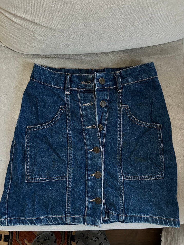 Düğmeli, büyük cepli, koyu mavi denim mini etek, günlük kullanıma uygun rahat bir sokak stili sunar.