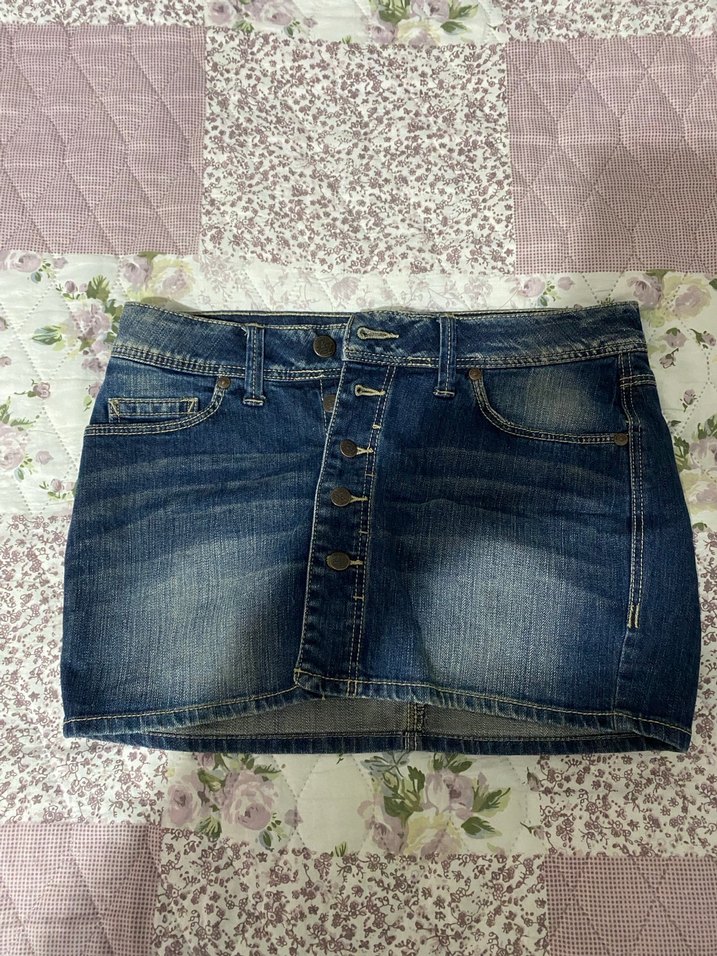 Düğmeli, koyu mavi renkli denim kumaştan, vücuda oturan kadın mini etek. Günlük kullanıma uygun, desen içermeyen rahat bir modeldir.