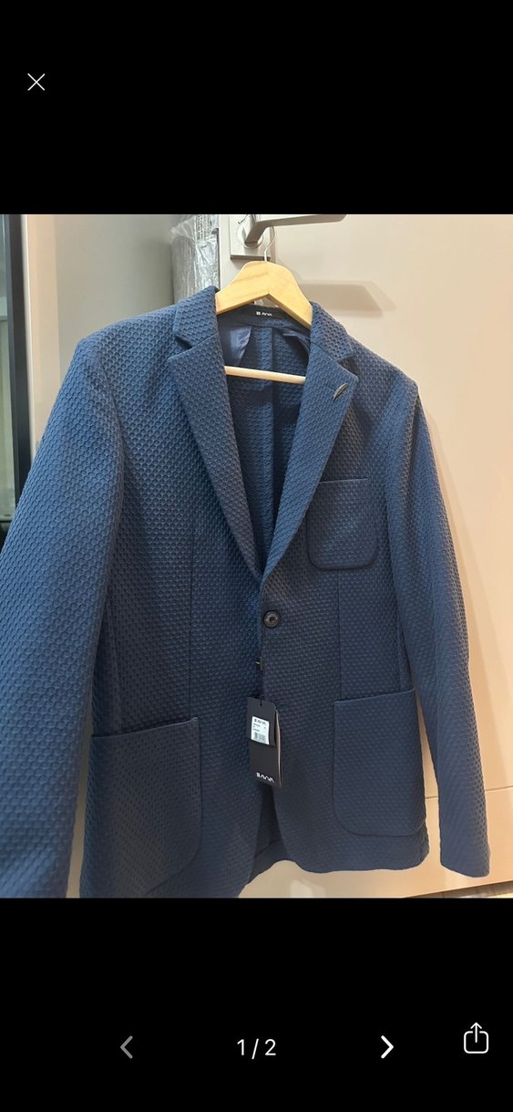Düğmeli, koyu mavi erkek ceket, notched yaka ve uzun kollu. Sentetik kumaştan, normal boyda ve regular fit, ofis için uygun. Avva sıfır etiketli