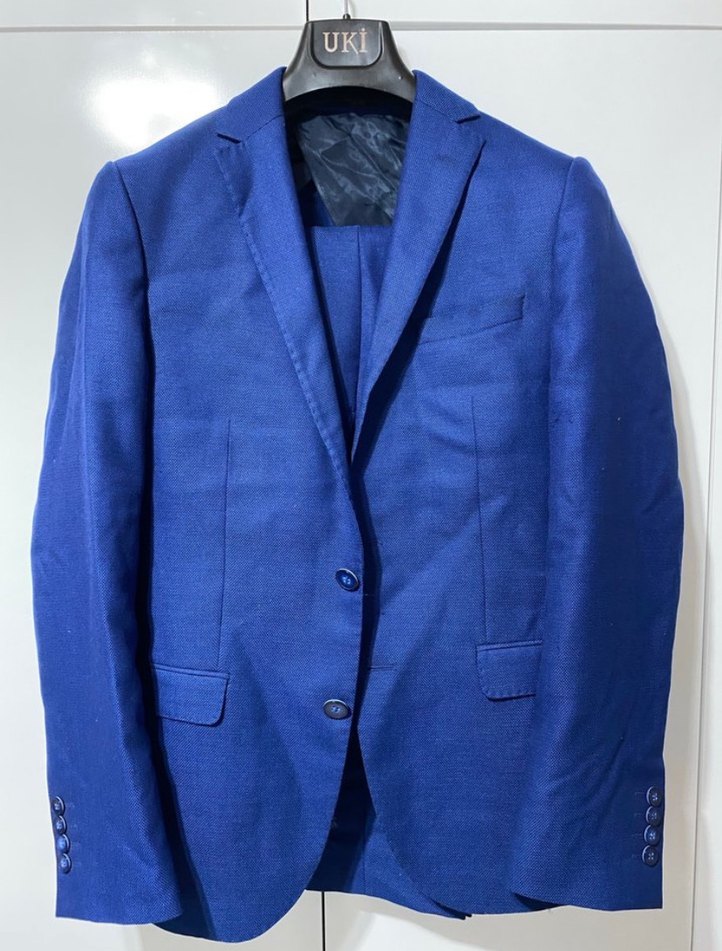 Düğmeli, koyu mavi erkek takım ceketi, notched yaka ve regular kesimlidir. Uzun kollu ve klasik şıklık sunar, ofis için uygundur.