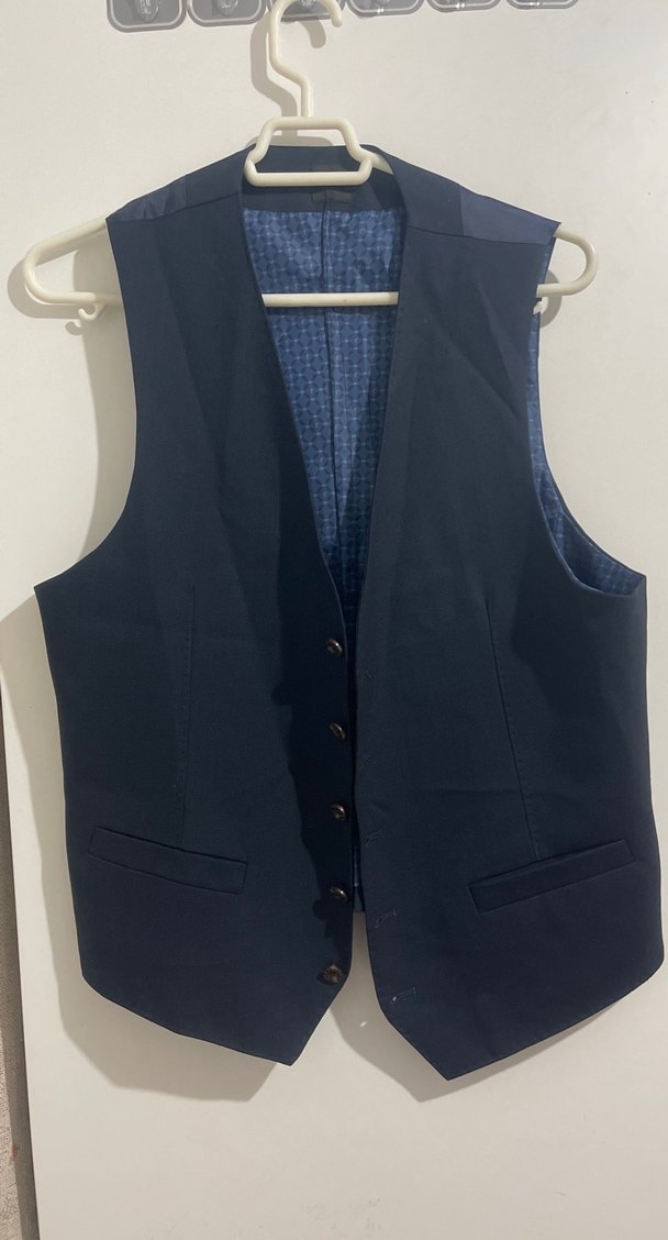 Düğmeli ve koyu mavi renkli, notalı yaka detaylı erkek yelek, normal kesim ve kolsuz tasarıma sahiptir. Sentetik kumaştan üretilmiştir, iş ve sokak stiline uygundur.