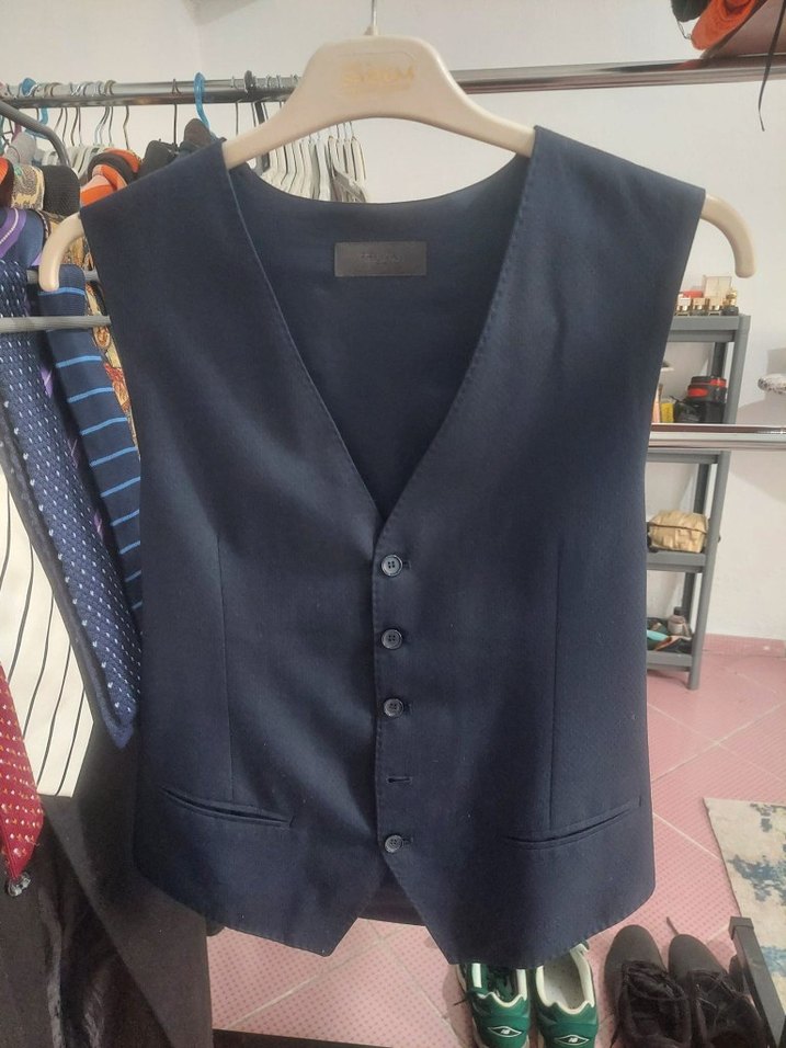 Düğmeli, koyu mavi renkte, regular fit ve kesik yaka erkek yelek. Ofis ve sokak stiline uygun, desen içermeyen model ihracat fazlası twn