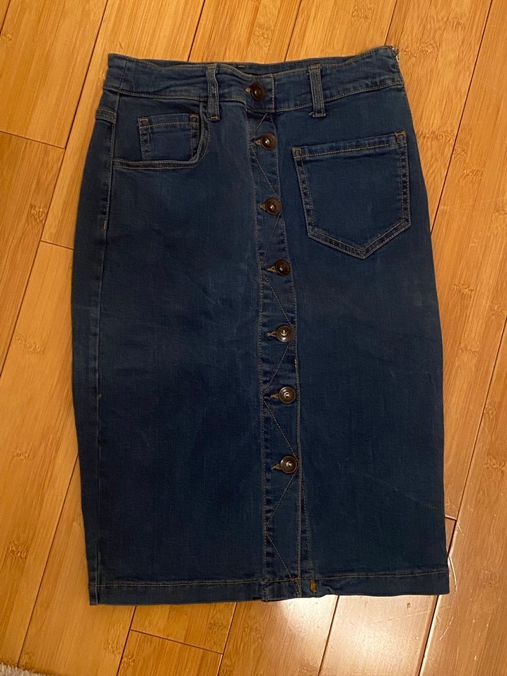 Düğmeli, cepli ve hamile kullanımına uygun, koyu mavi renkte fitted kesim midi kot etek. Günlük kullanıma uygun, bohem tarzda bir parça.
