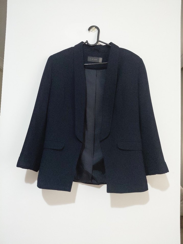 Düğmeli, koyu mavi kadın blazer ceket. Notlu yaka ve uzun kolludur. Midi boyda, düz ve sentetik kumaştan, ofis kullanımı için uygundur.