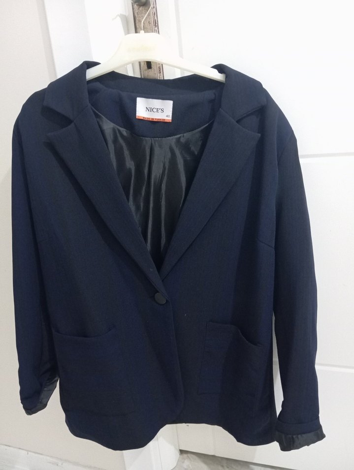Düğmeli önü, uzun kollu, koyu mavi kadın blazer ceket. Normal kesim ve midi boyda, ofis stiline uygun sentetik kumaştan.