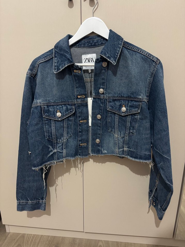 Düğmeli, uzun kollu, notched yaka ve bol kesime sahip koyu mavi denim ceket. Kısa boyda, kesik detaylı, günlük rahat stil için uygun.