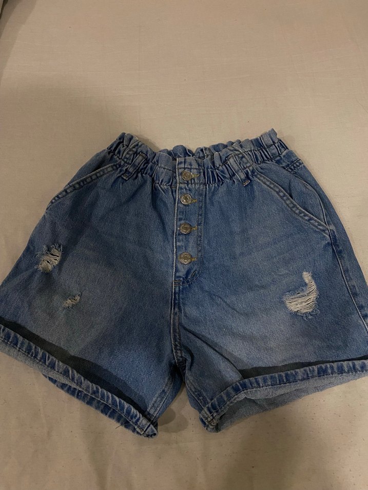 Düğmeli ön kısım ve bol kesimiyle koyu mavi denim mini şort, günlük rahat kullanım için uygundur. Elastik bel ve hafif yırtık detaylar bulunur.