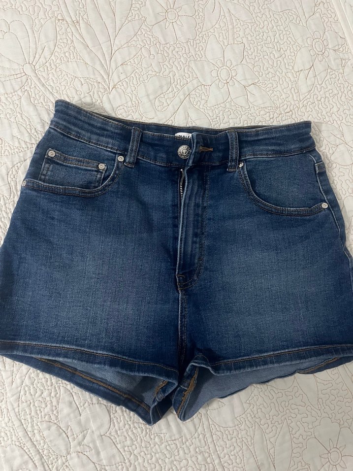 Düğmeli, koyu mavi renkli, mini uzunlukta, fit kesim kadın denim şort. Günlük kullanıma uygun sade ve desensiz tasarım.