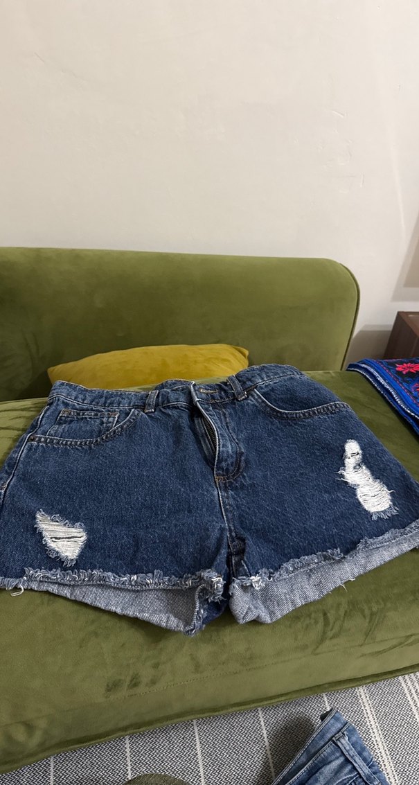 Düğmeli, bol kesim ve yıpranmış detaylara sahip koyu mavi mini denim şort, günlük rahat sokak stili için uygundur.