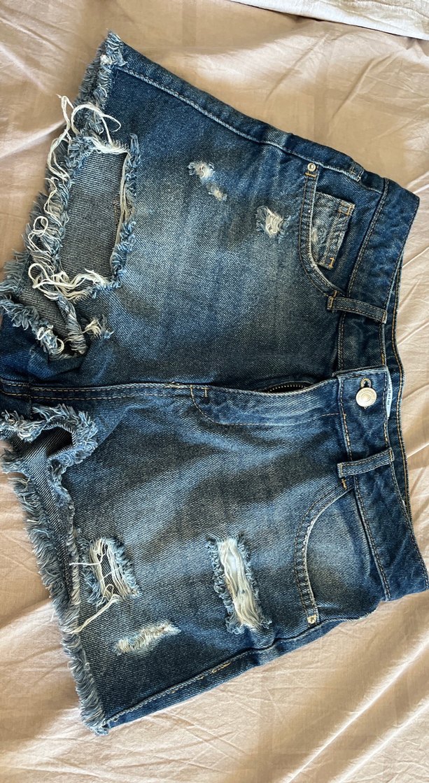 Düğmeli,yırtık detaylı koyu mavi mini denim şort, günlük sokak tarzı için uygundur. Hafif esnektir.
