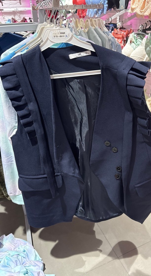 Düğmeli, koyu mavi, sentetik kumaşlı, normal uzunlukta, kolsuz, kesimli kadın yelek ceket. Sadece bir kere giyildi gayet iyi durumda.