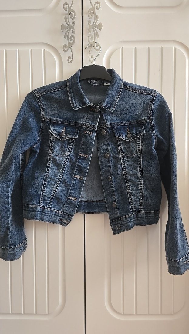 Düğmeli, koyu mavi renkte çoçuk denim ceket. Notlu yaka ve sokak tarzına uygun günlük kullanıma uygundur. Kızım uzun boylu olduğu için, fazla giyemedi, 1 kere anca.