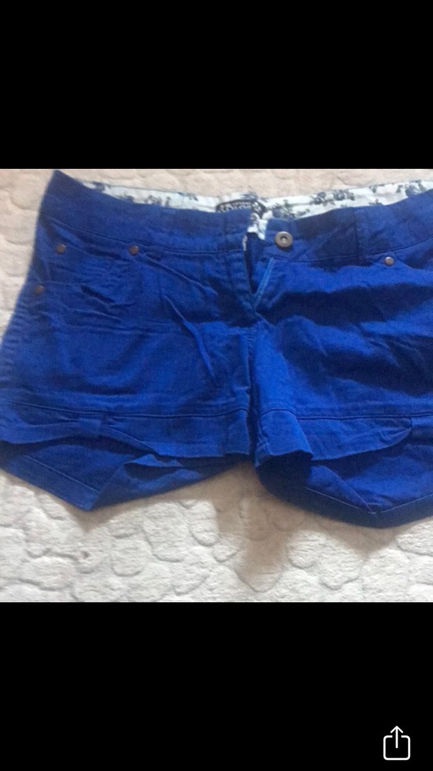 Düğmeli ve kısa kesim olan koyu mavi mini denim şort, günlük sokak stili için uygundur.