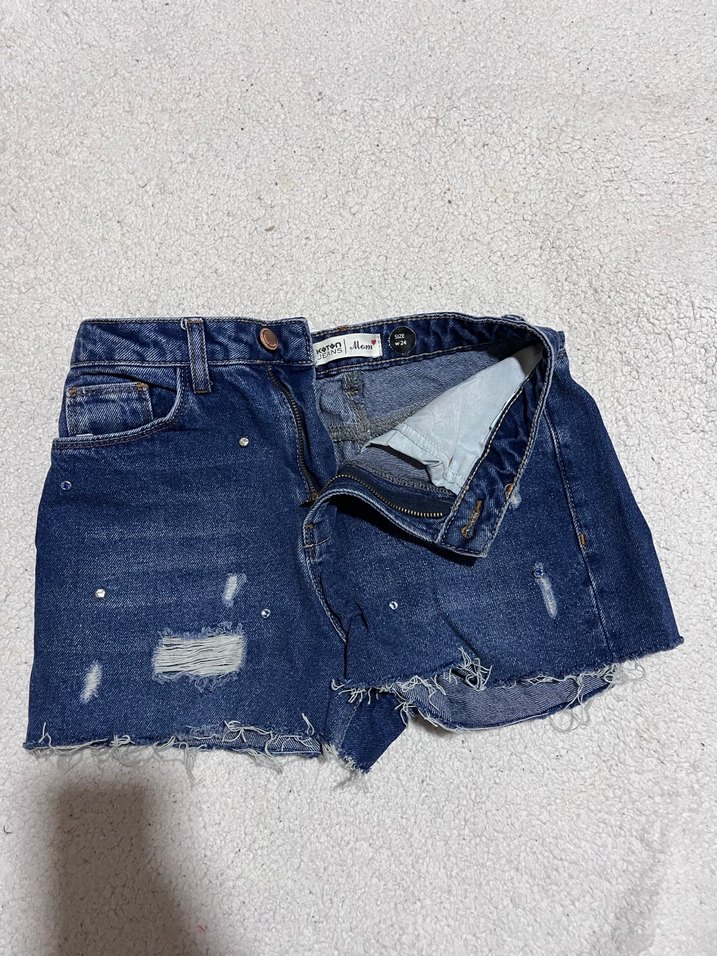 Düğmeli, yıpranmış detaylı koyu mavi mini denim şort, rahat kesimiyle günlük sokak stiline uygundur.