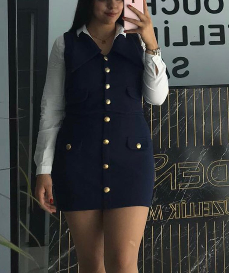 Düğmeli Koyu Mavi Mini Elbise