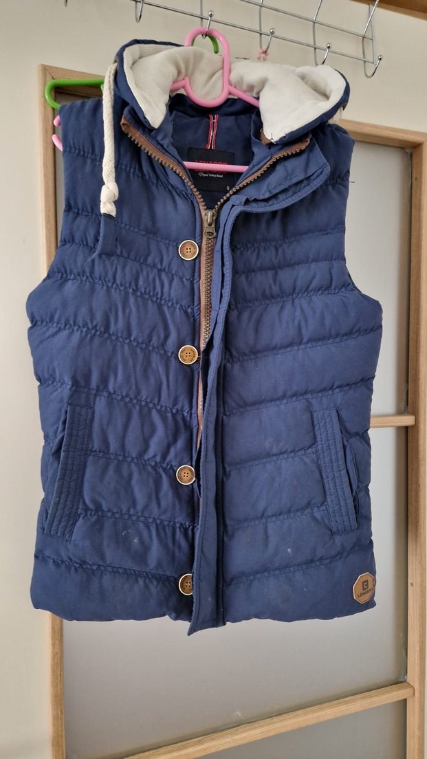 Düğmeli, kolsuz, koyu mavi yelek. Fitted kesim ve kesik yakasıyla rahat ve şık bir günlük kullanım ürünü.