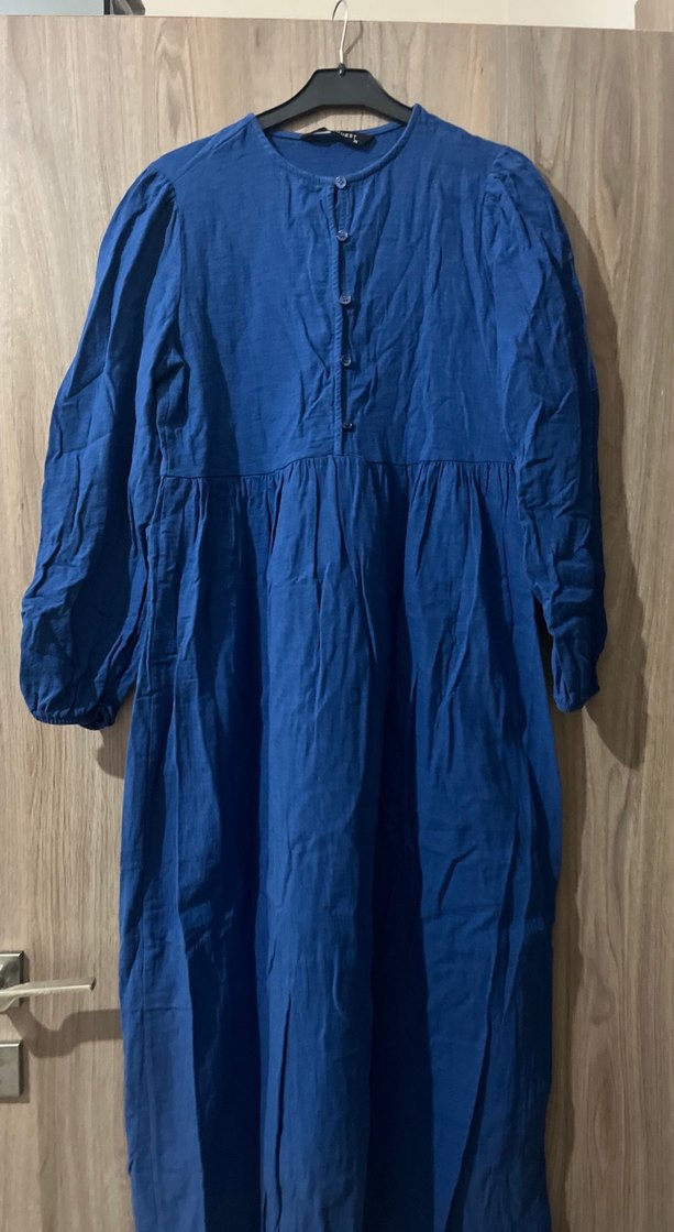 Düğmeli, uzun kollu, keten kumaştan yapılmış koyu mavi elbise. Salaş kesimi ve yuvarlak yaka detayı ile günlük kullanıma uygundur.