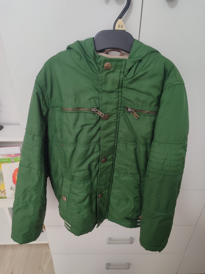 Düğmeli kapamalı, koyu yeşil tonunda, notlu yaka detaylı, yumuşak ve sıcak dokulu erkek çocuk ceketi. Göğüs kısmında fermuarlı cepler bulunur. Trend sokak stili için uygun.