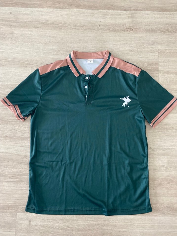 Düğmeli yakalı, kısa kollu erkek polo tişörtü, sentetik kumaştan üretilmiş. Koyu yeşil renk ve baskılı detaylara sahip, günlük rahat kullanım için uygundur.