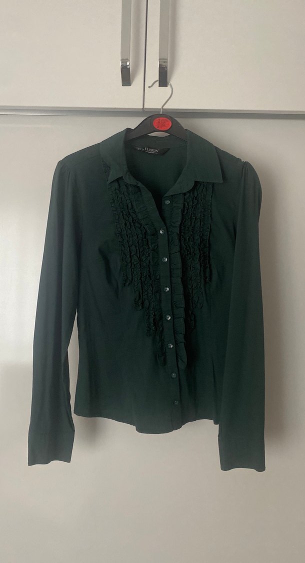 Düğmeli, uzun kollu ve yakalı bu yeşil gömlek, keten kumaştan üretilmiş olup gotik tarz detaylara sahiptir. Ofis kullanımı için uygundur.