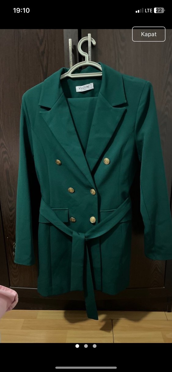 Düğmeli ön cep ve kemer detaylı koyu yeşil kadın blazer ceket, uzun kollu ve regular fit kesime sahiptir. Ofis ve klasik tarz için uygundur.