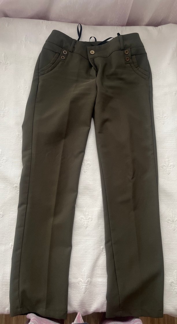 Düğmeli, normal boy midi koyu yeşil kumaş pantolon, ofis kullanımı için uygun. Pürüzsüz sentetik kumaştan, gri tonları mevcut.