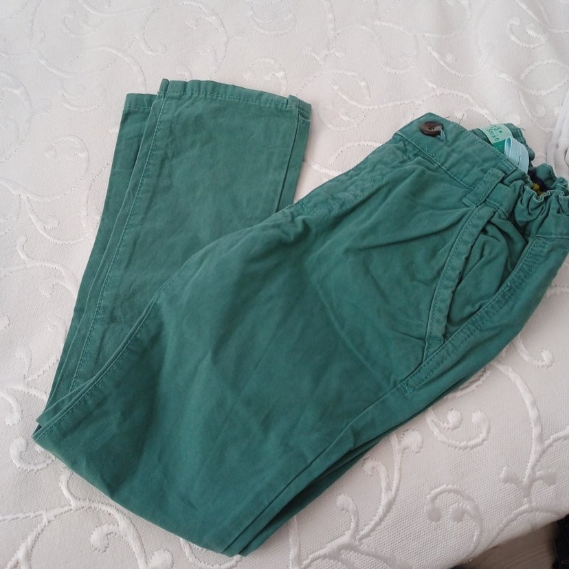 Koyu yeşil keten kumaştan, düğmeli ve bol kesim erkek çocuk pantolonu, rahat ve sade bir tasarıma sahiptir.