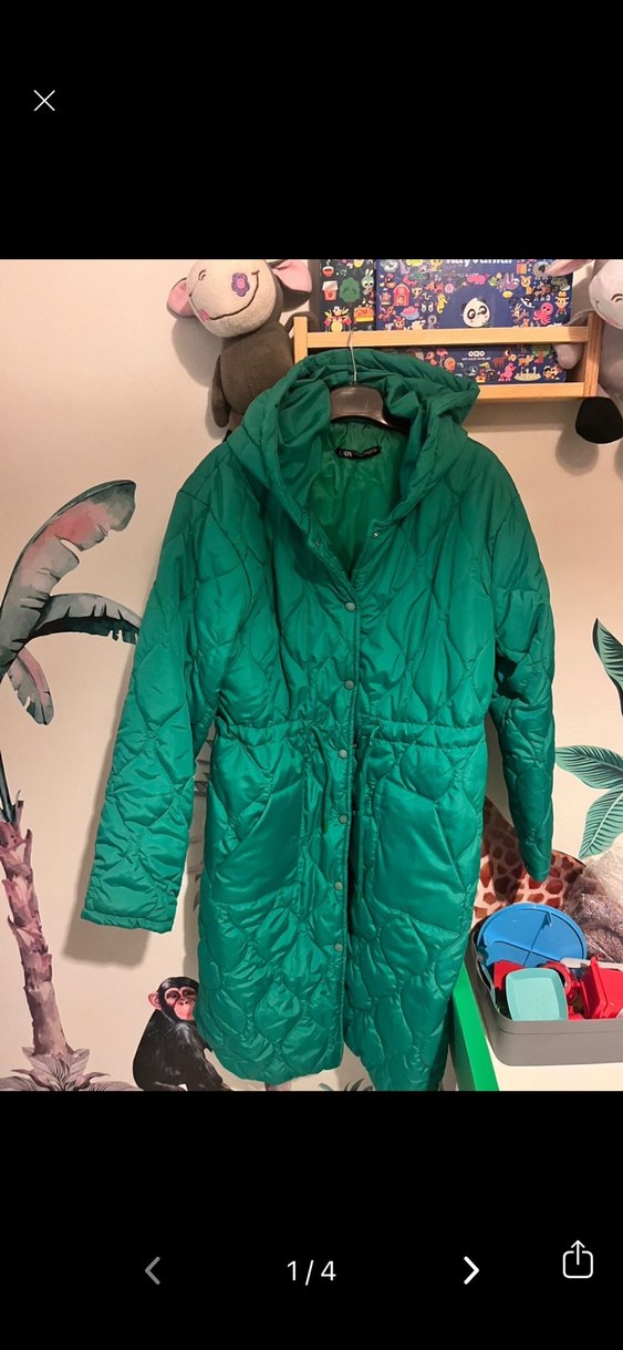 Düğmeli, uzun kollu, yakalı ve midi boyda koyu yeşil kadın mont. Rahat ve sıcak kumaştan, günlük kullanıma uygun.