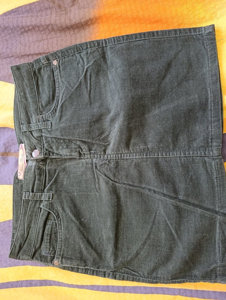 Düğmeli, koyu yeşil renkte, kadife kumaştan yapılmış, mini boy ve dar kesim etek. Günlük kullanıma uygundur.