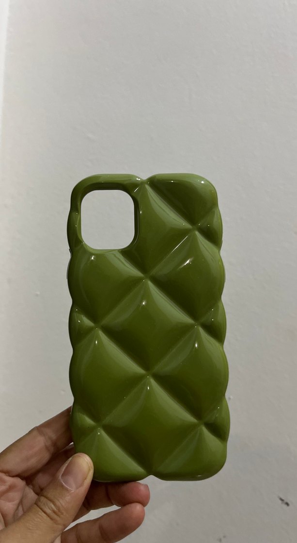 Düğmeli, dokulu tasarıma sahip çağdaş koyu yeşil telefon kılıfı.