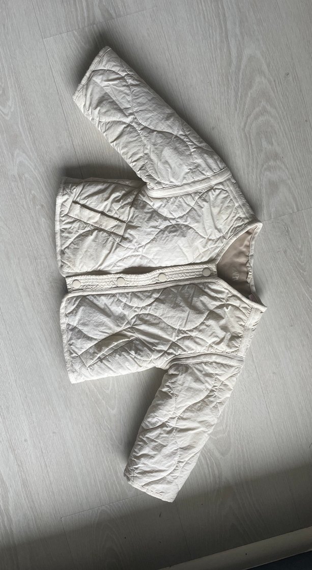 Krem renkli kapitone mevsimlik ceket, düğmeli, uzun kollu, normal boy midi kesim Bebek ceket. Sokak stiline uygun, sade ve rahat bir modeldir. Üzerinde ufak soluk bir çizgi var temiz geri kalan yerleri tertemizdir