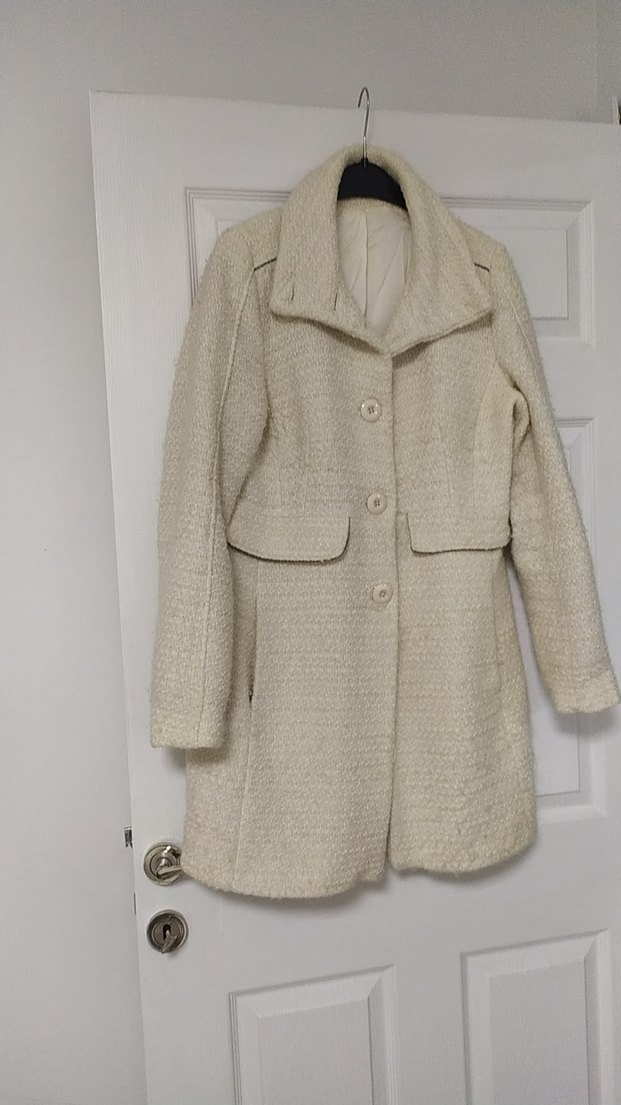 Düğmeli, geniş yakalı krem renkli, dokulu kumaştan yapılmış kaban.Kumasi kendinden tüylü ve simli,Şık görünüm için cepleri kapaklıdır. iki koltuk altindan göğüs ölçüsü:50 cm ,boy :87-88 cm omuzdan aşağı,beyaza yakın krem rengi,kuru temizleme ye verilirse iyi olur, dolapta duruyor ,2 sezondur