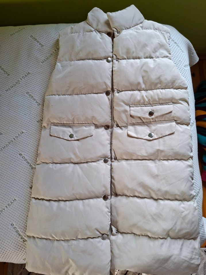 Düğmeli ön kısmı ve kırma yaka detayı olan krem kolsuz yelek. Yumuşak keten kumaştan, normal boyda, vücuda oturan kesim.
