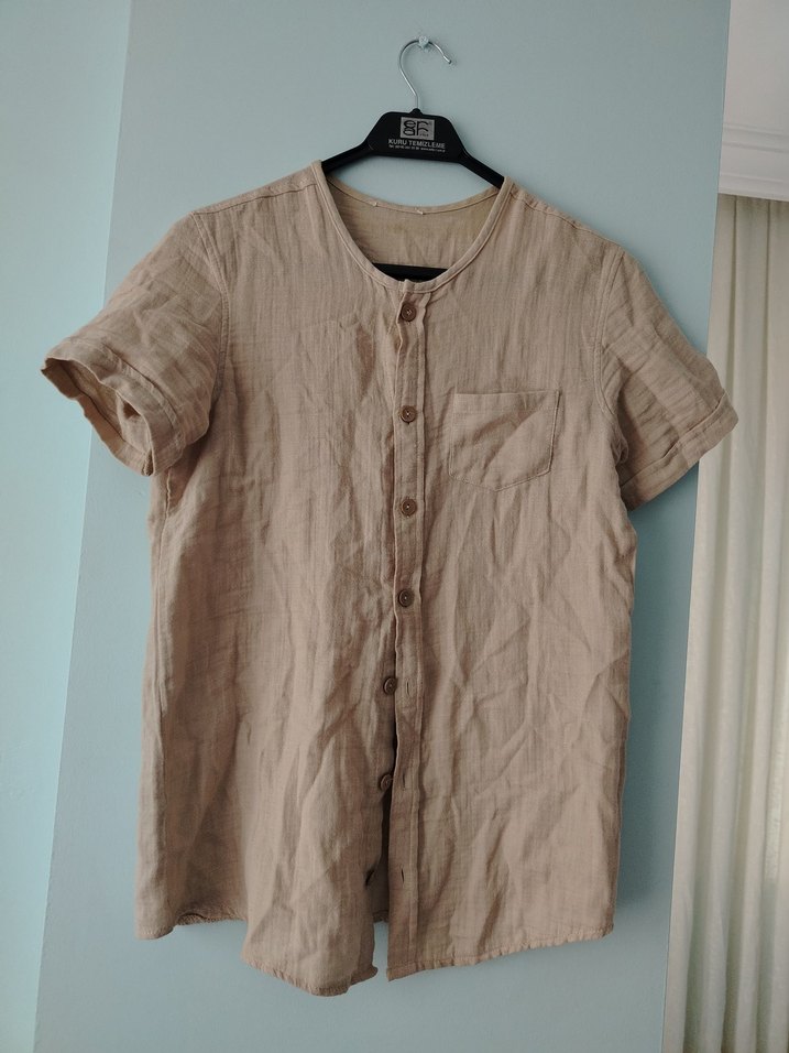 Düğmeli, kısa kollu, krem keten gömlek. Salaş kesimi, yuvarlak yaka ve göğüs cebine sahiptir. Midi boy, günlük kullanıma uygundur. S M uyumlu