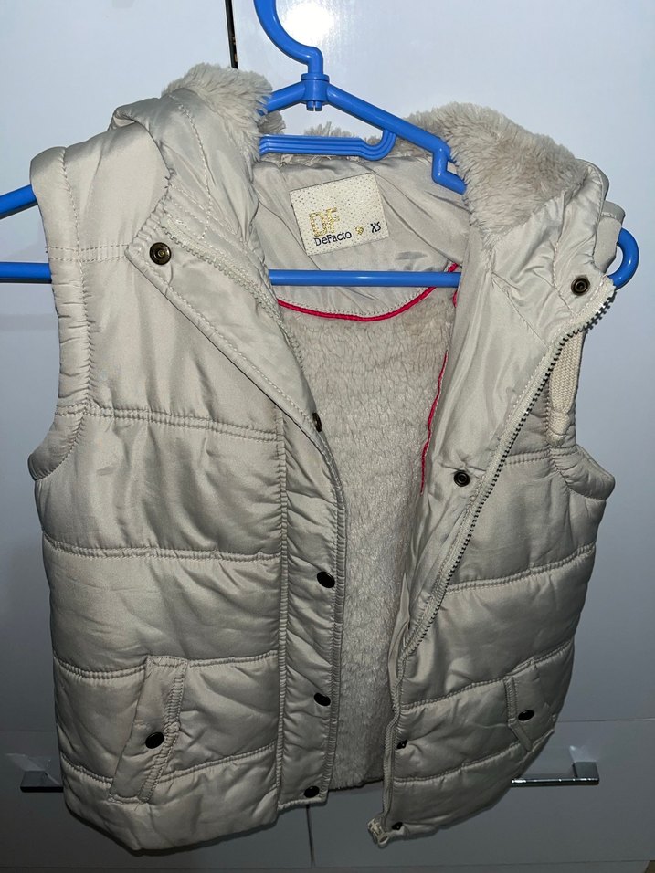 Düğmeli, yakalı ve krem renkte, içi yumuşak ve sıcak astarlı kız yeleği. Sokak tarzı için uygun, kolsuz ve vücuda oturan kesimde.