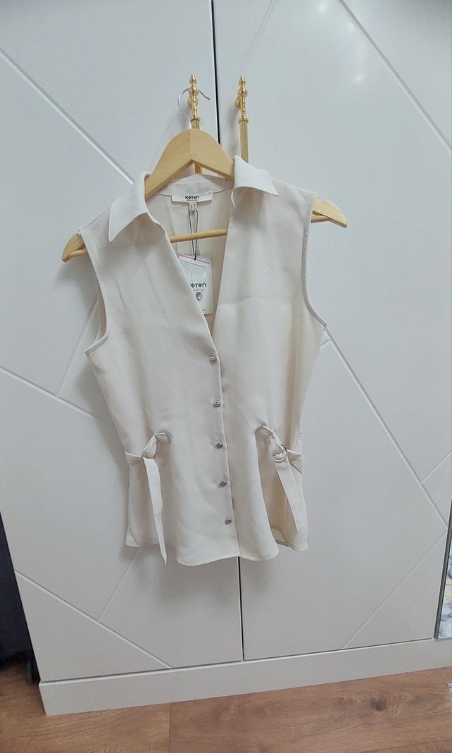 Düğmeli Krem Kolsuz Bluz