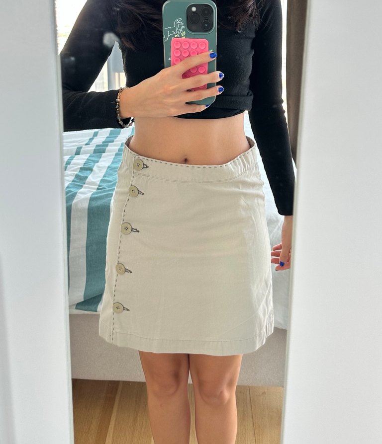 Pamuklu, düğmeli beyaz mini etek, yan detaylı ve dar kesim. Günlük kullanıma uygun, rahat bir parça.