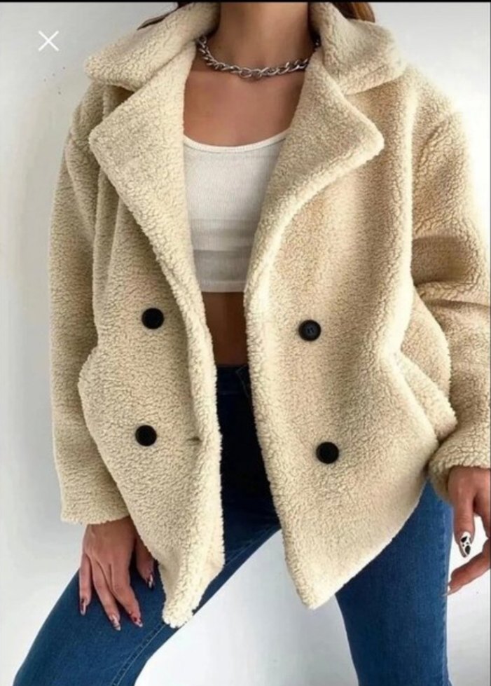 Krem rengi, düğmeli, mini kısa kesim kadın kaban. Notlu yaka ve uzun kollu, bol kesim rahat ve sıcak dokulu bir tasarımdır.