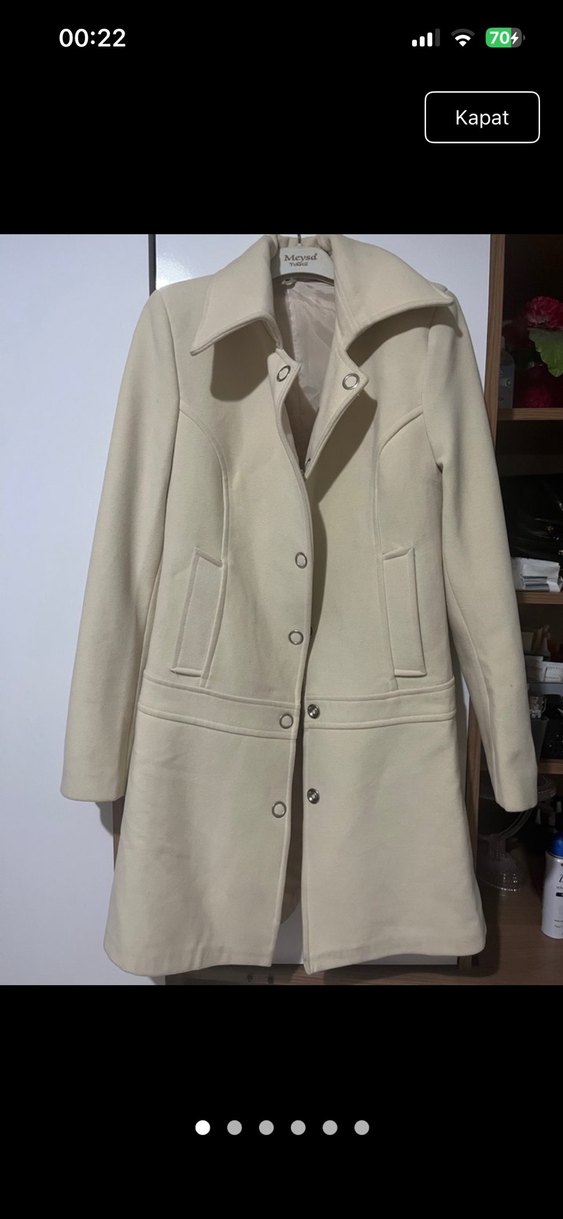 Krem rengi kaban, düğmeli kapama ve yapılı yaka detayına sahiptir. İki cep bulunur, temiz ve şık bir görünüm sunar.