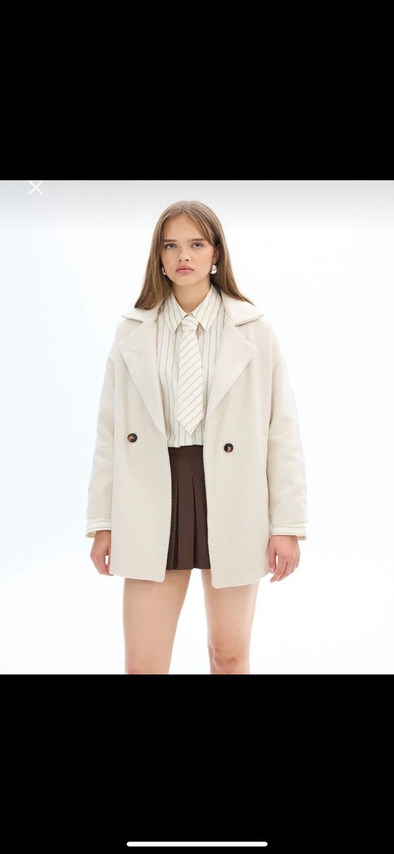 Krem renginde, çift düğmeli ve geniş yakalı kadın kabanı. Yumuşak ve sıcak dokusuyla soğuk havalar için uygundur. ️