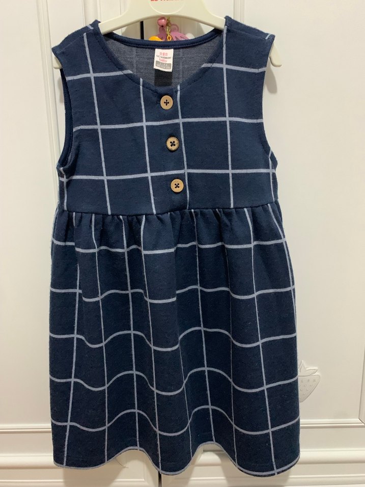 Düğmeli Lacivert 3-4 yaş ,Kareli Kolsuz Kız Elbisesi