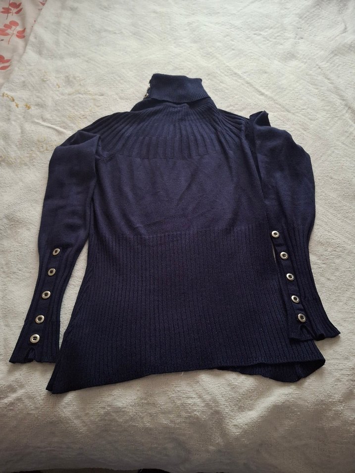Bu lacivert, düğmeli uzun kollu kadın kazak, balıkçı yaka ve uzun kesimiyle rahat ve gotik tarzda günlük kullanım için uygundur.