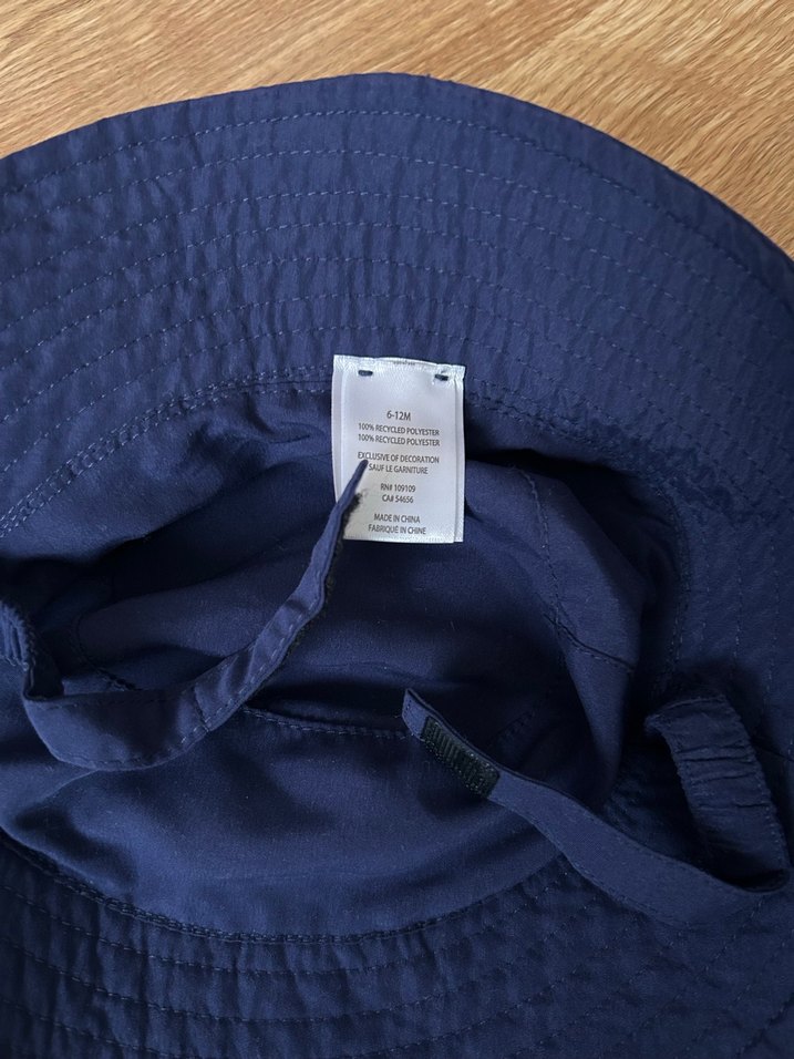Lacivert renkte, parlak sentetik kumaştan yapılmış, düğmeli tasarıma sahip bebek şapkası. Sokak giyimi ve athleisure tarzına uygundur.
