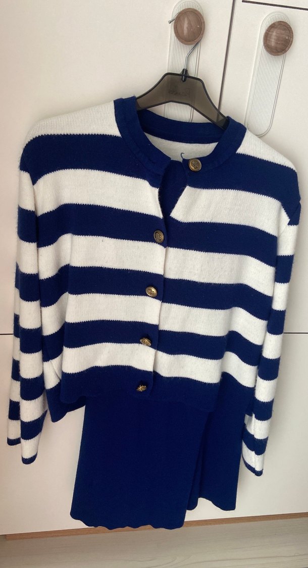 Düğmeli, bisiklet yaka etekli triko takım. Yumuşak örme kumaştan, lacivert ve beyaz çizgili, günlük rahat kullanım için uygun.