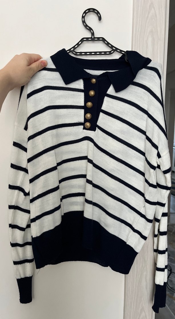 Kadınlar için düğmeli, yakalı uzun kollu çizgili triko kazak. Rahat kesimi ve siyah beyaz renkleriyle günlük sokak stiline uygundur.