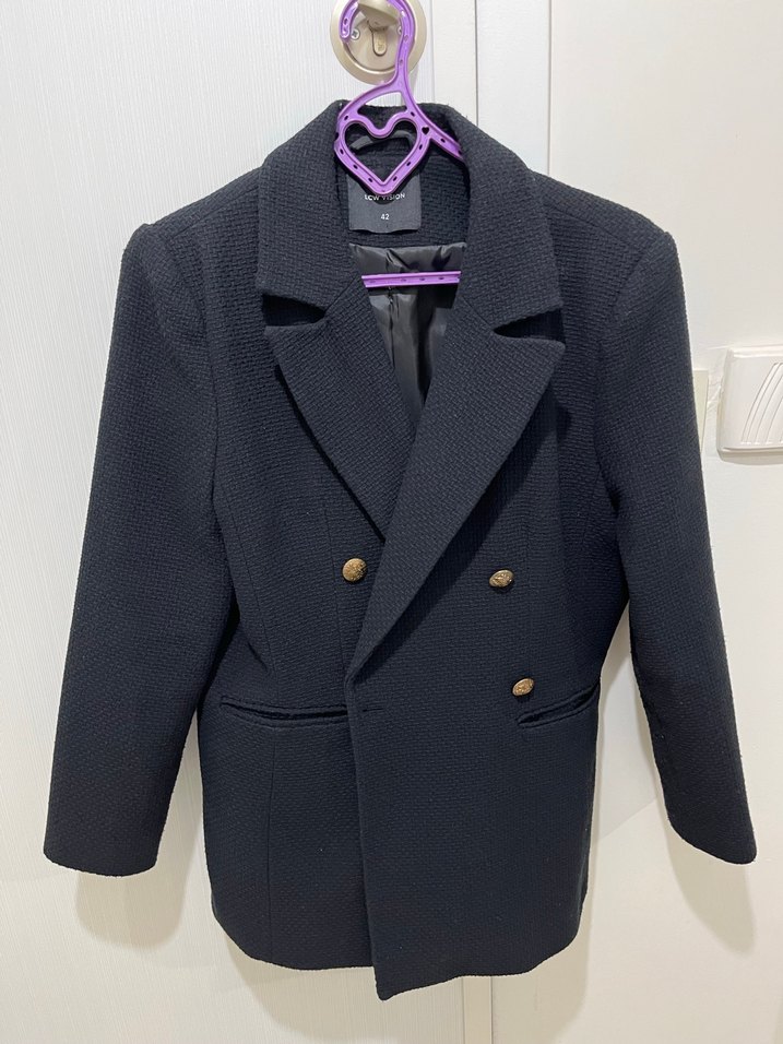 Düğmeli, yakalı ve uzun kollu orta uzunlukta blazer ceket temizdir