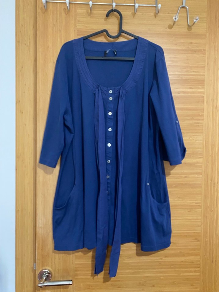 Lacivert, düğmeli ve uzun kollu büyük beden, rahat kesim ve V yaka ile midi boyda, yumuşak pamuk kumaştan üretilmiştir. Hiç kullanılmadı kilo verdiğim için tertemizdir