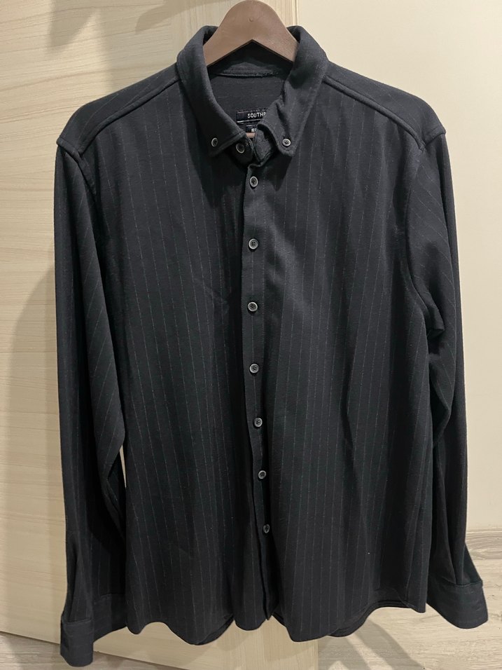 Düğmeli, sivri yakalı, uzun kollu lacivert çizgili erkek gömleği. Normal kesim ve sentetik kumaştan, ofis veya günlük tarz için uygun.