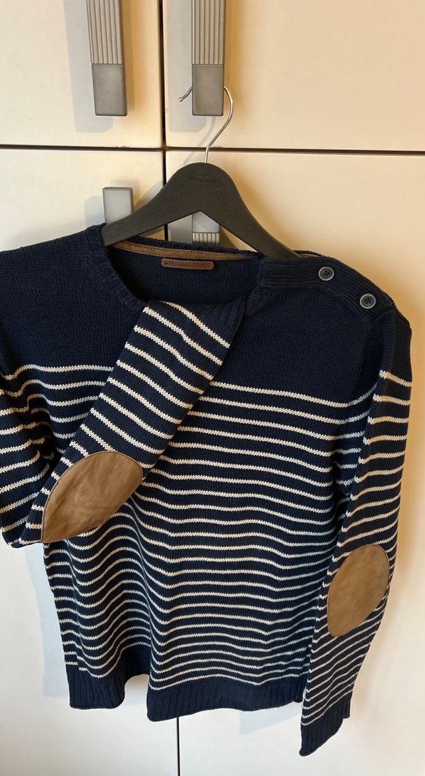 Düğmeli, yuvarlak yaka, uzun kollu lacivert çizgili kadın kazak. Bol kesim ve dirsek yamaları ile günlük rahat sokak stili için uygundur.