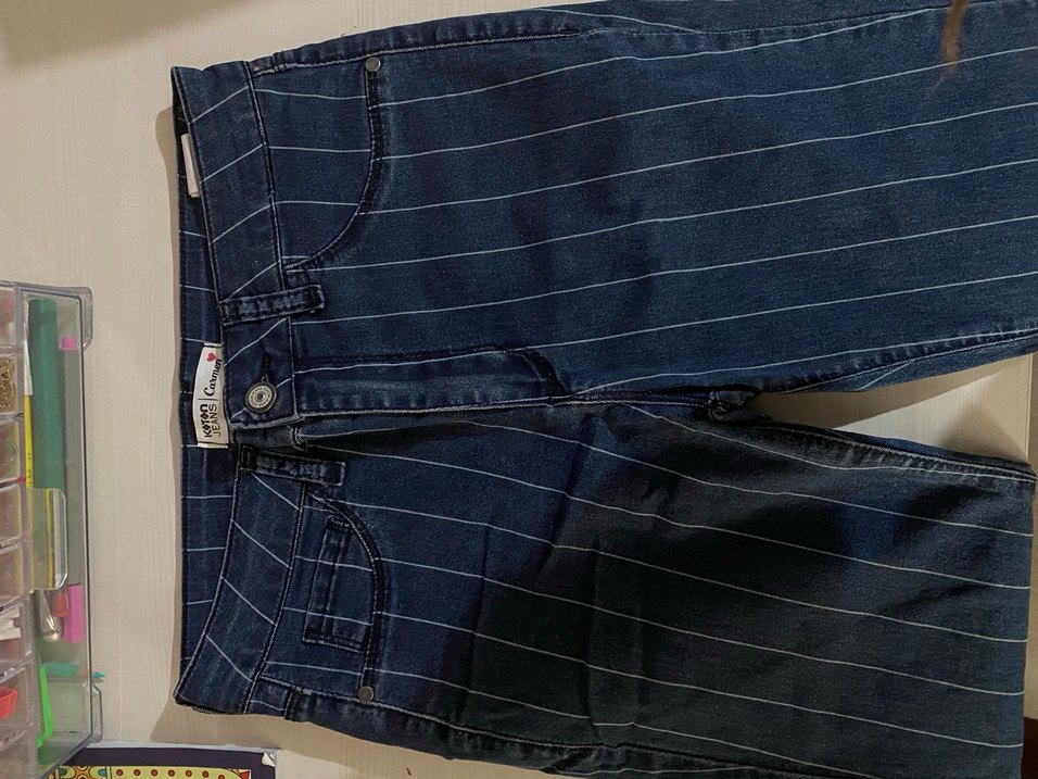 Düğmeli, çizgili desenli lacivert kadın kot pantolon. Midi boy ve regular fit, günlük ve sokak stili için uygun.